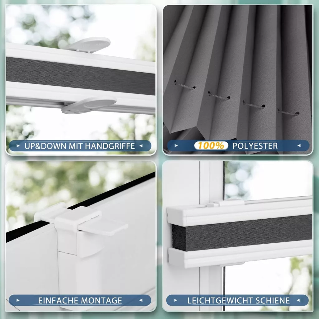 Starostlivosť o plisovanú roletu je veľmi jednoduchá. Na odstránenie prachu z tkaniny použite mäkkú kefu alebo vysávač. Na odstránenie škvŕn použite navlhčenú handričku alebo povrch jemne utrite. Vyhnite sa používaniu silných chemikálií, pretože môžu poškodiť polyesterový materiál.