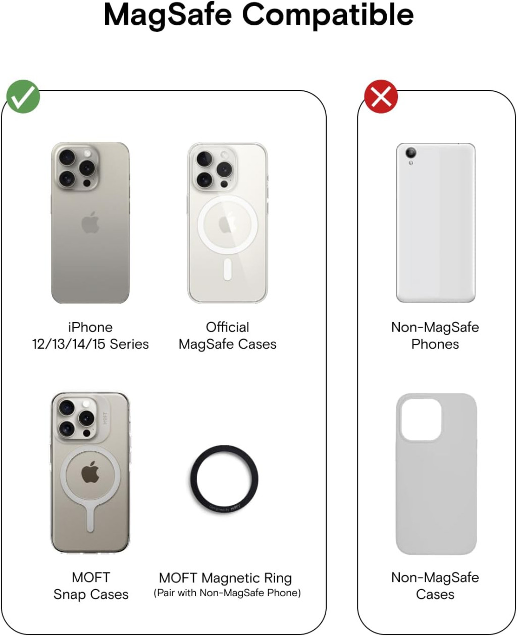 Az iPhone 16, 15, 14, 13 és 12 sorozattal való teljes kompatibilitás azt jelenti, hogy hosszú ideig használhatod ezt a wallet standot. Legyen szó utazásról, irodai munkáról vagy otthoni használatról, a MOFT wallet stand mindig kéznél van, amikor szükséged van rá.