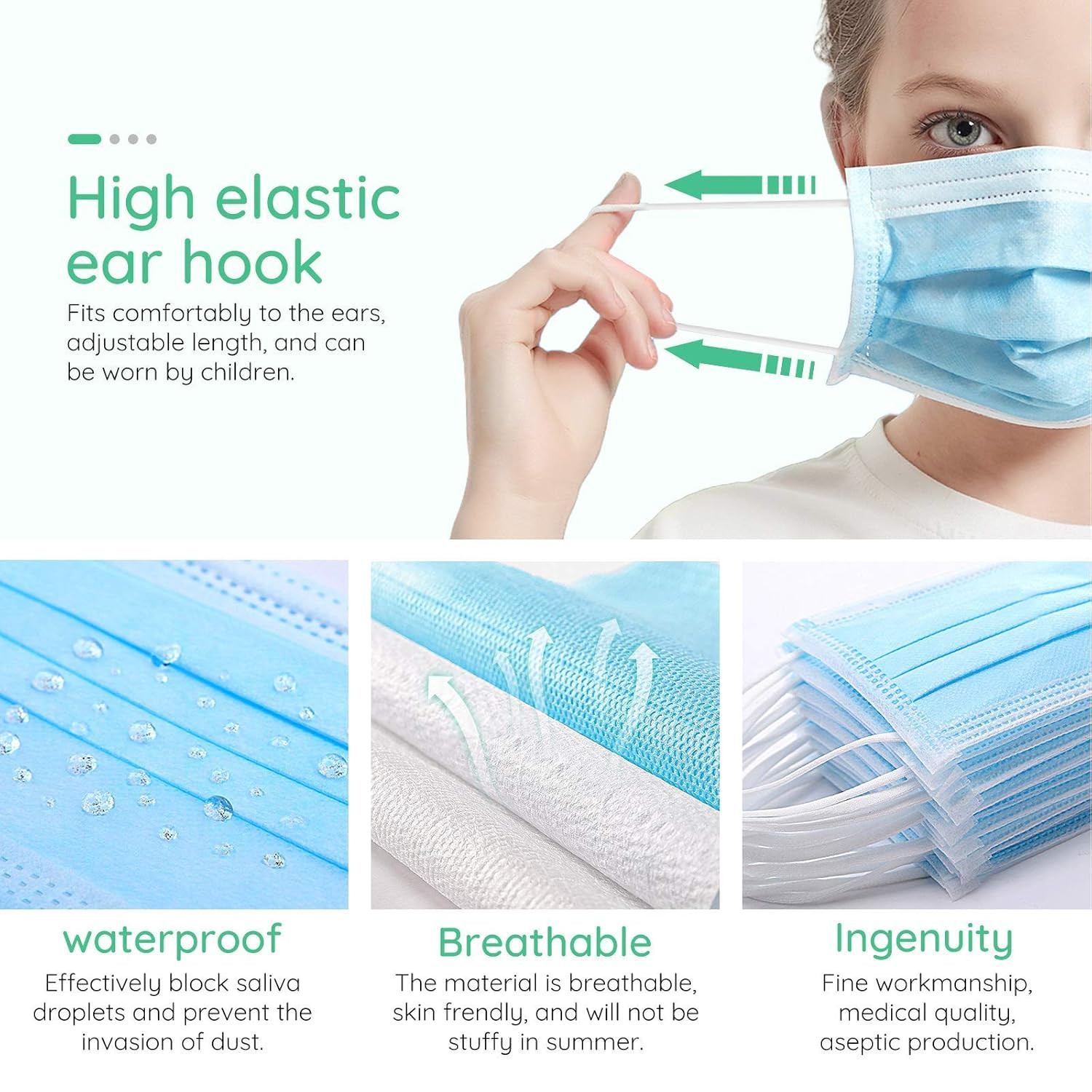A Wawech 50 darabos eldobható szájmaszk csomag professzionális minőségű védelmet nyújt a mindennapi használatra. Minden maszk három rétegből áll, amely hatékony szűrést és kényelmes viselést biztosít. A puha, nem szőtt anyag belső rétege maximális komfortot nyújt, míg a külső fleece réteg és a középső olvadt szálú szűrőréteg megbízható védelmet garantál. Ez a termék ideális választás felnőttek, nők és gyermekek számára egyaránt.