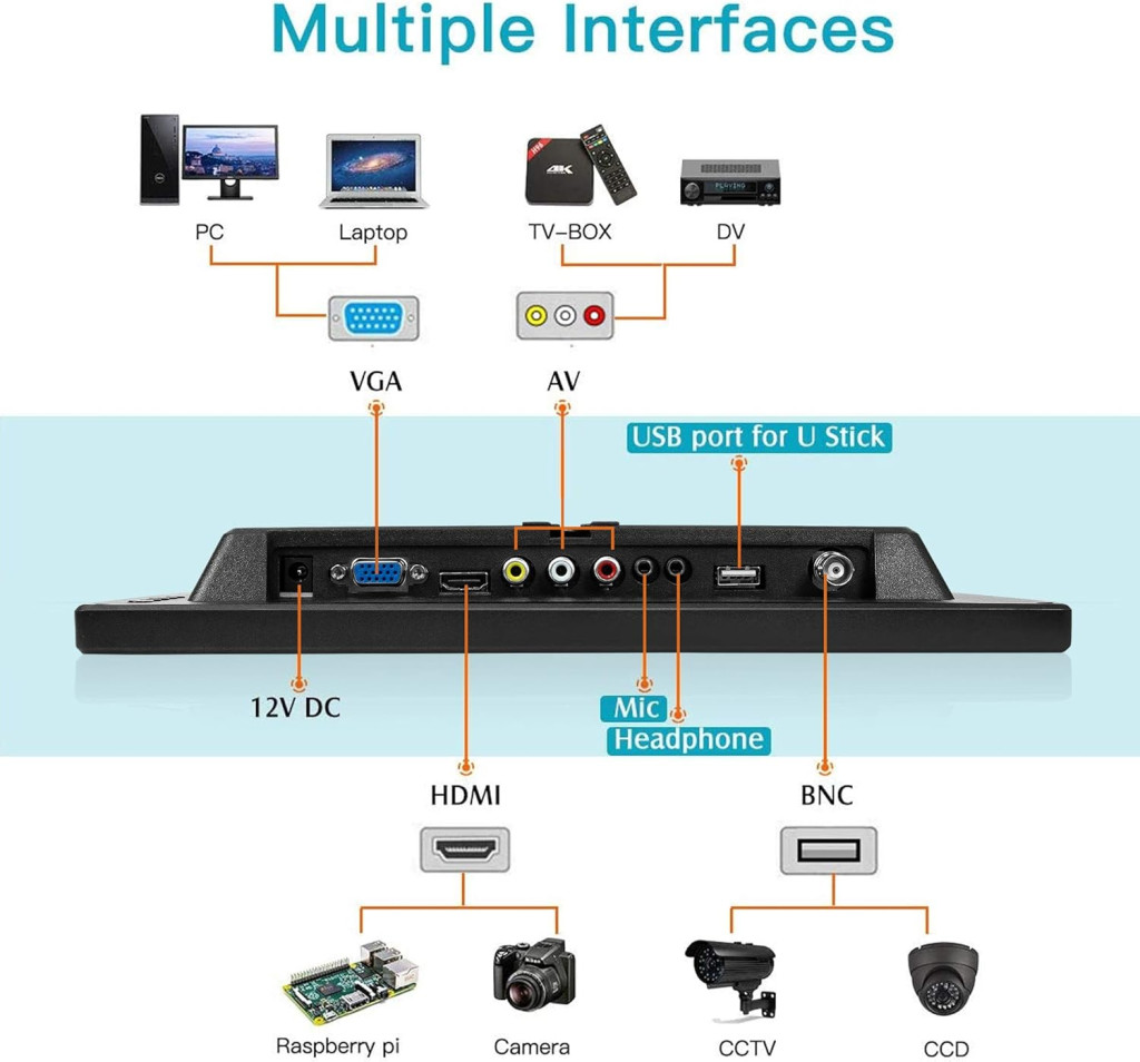 HDMI, VGA, BNC, AV és DC12V tápellátás. Egy audio bemenet az audio jelek továbbításához.