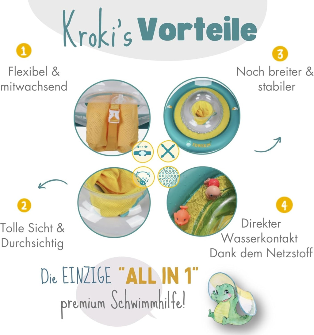 Plávacie koleso EDWEKIN® Kroki je prémiová pomôcka na výučbu plávania, ktorú vyvinuli rodičia pre rodičov. Tento inovatívny produkt je ideálny pre bábätká a malé deti od 6 mesiacov do 3 rokov, ktoré ešte nemajú v obľube plavecké rukávy alebo pomôcky s popruhmi. Model Kroki vďaka svojmu jedinečnému dizajnu a starostlivo navrhnutým funkciám zaisťuje, že čas strávený vo vode bude bezpečný, pohodlný a zábavný pre celú rodinu.