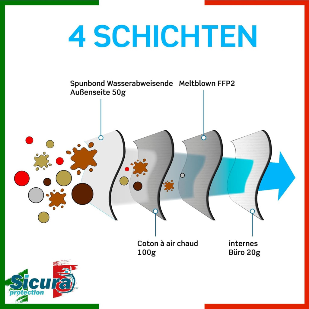 A SICURA FFP2 maszk ideális választás számos helyzetben és környezetben. Kiváló védelmet nyújt PM2.5 részecskék, élelmiszer-por, vegyi anyagok, szén- és cementpor, valamint fémmaradványok és gyártási folyamatok során keletkező szennyeződések ellen. Ajánlott az egészségügyi dolgozók, szociális intézmények munkatársai, valamint az ipari és építési szektorban dolgozók számára. Alkalmas továbbá az allergiában szenvedők és az immunrendszere legyengült személyek számára is, akik fokozott védelemre szorulnak.