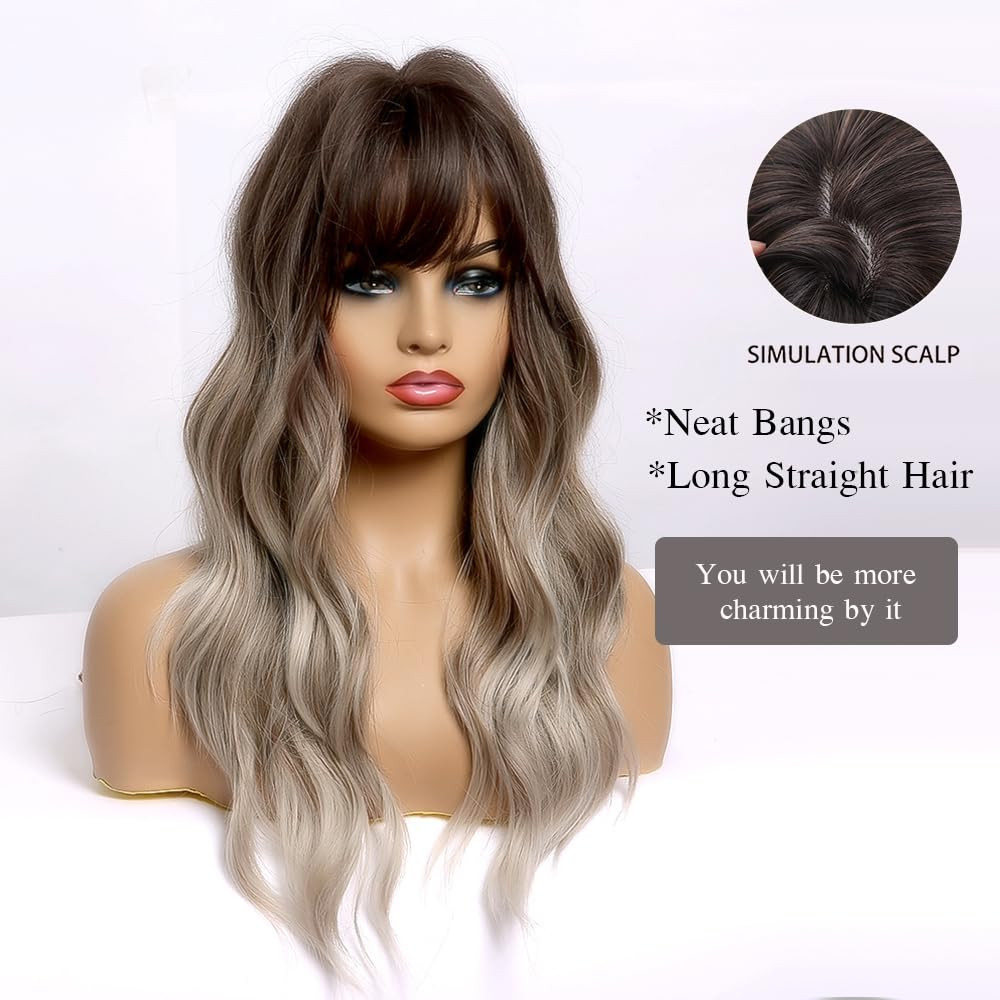 Esmee 61 cm Dlhá Vlnitá Parochňa s Ofinou - Ombre Hnedo-Sivá Tepluvzdorná Syntetická Dámska Parochňa s Nastaviteľnou Veľkosťou Hlavy