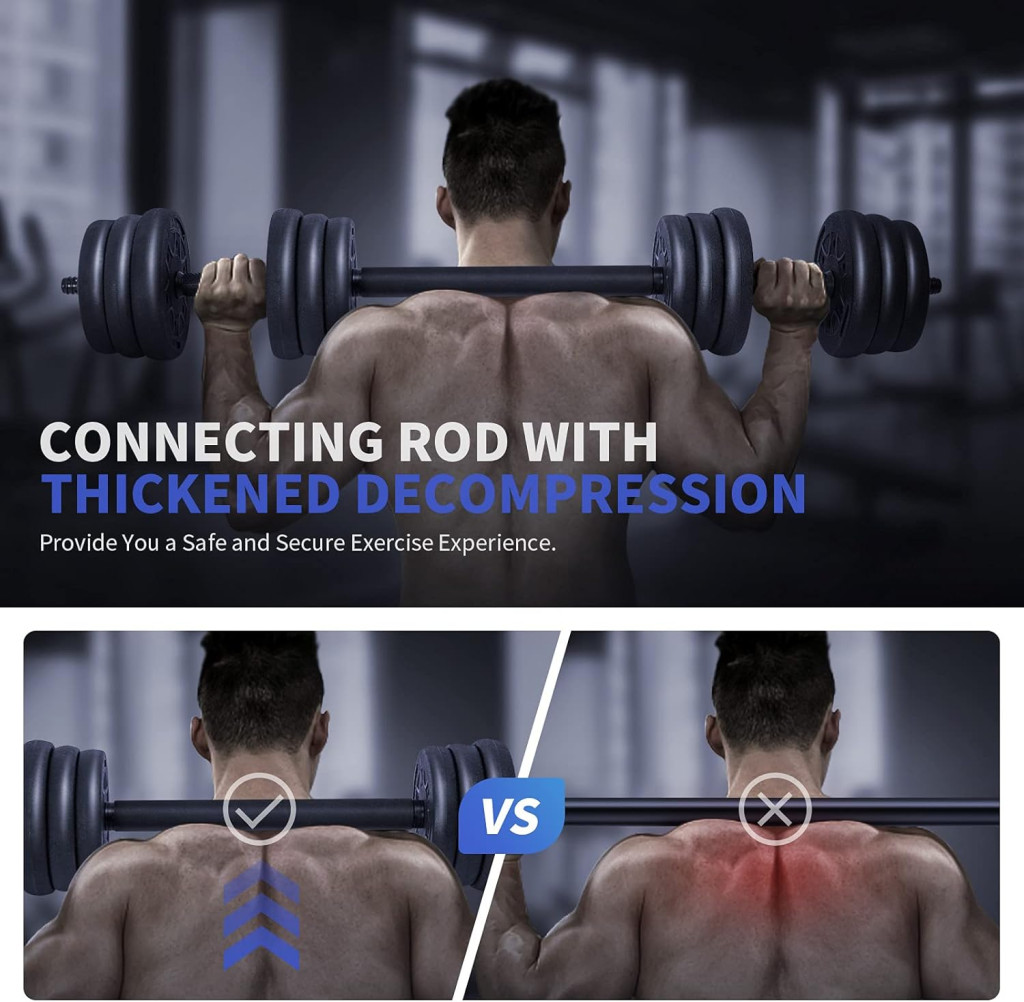 Systém nastaviteľnej hmotnosti znamená, že nemusíte kupovať ďalšie sady, keď sa vaša sila zvýši. Jednoducho vymeňte kotúče a pokračujte v tréningu. Penová tyč a bezpečnostné uzávery zaistia, že váš tréning bude vždy bezpečný a pohodlný.