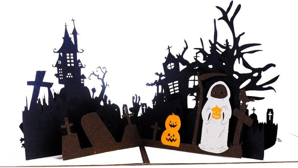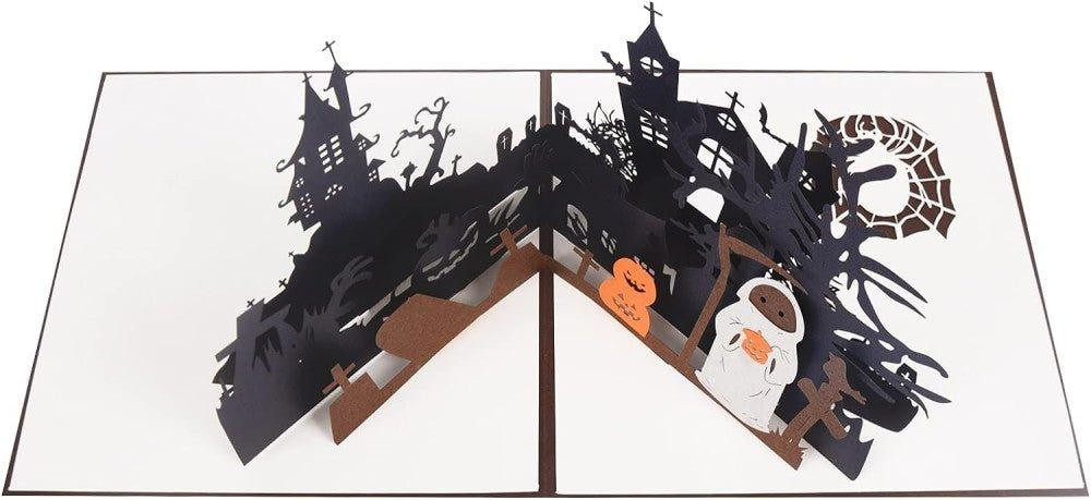 Po otvorení karty sa pred nami objaví trojrozmerná Halloweenska scéna, plná detailne prepracovaných prvkov. Čierne hrady, strašidelné stromy, náhrobné kamene a tekvice tvoria pozadie, zatiaľ čo v popredí sa na nás škerí hrôzostrašná oranžová tekvica. Laserom vyrezané siluety sú v dokonalej harmónii a vytvárajú skutočne desivý, no zároveň fascinujúci pohľad.