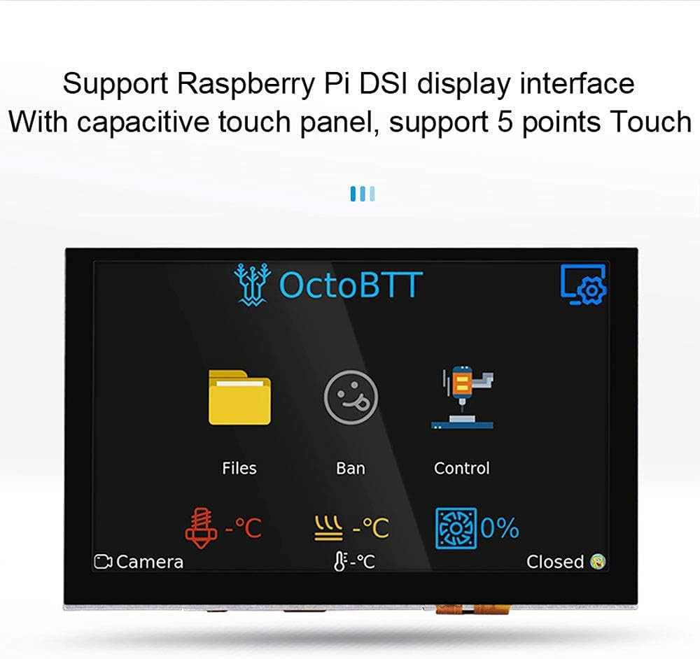 A PI TFT50 V2.0 egy professzionális minőségű Raspberry Pi LCD kijelző, amely közvetlenül a Raspberry Pi DSI Display interfészhez csatlakozik. Az 800x480 pixeles felbontás és 108x64,8 mm-es megjelenítési terület ideális a nyomtatási paraméterek valós idejű monitorozásához.
