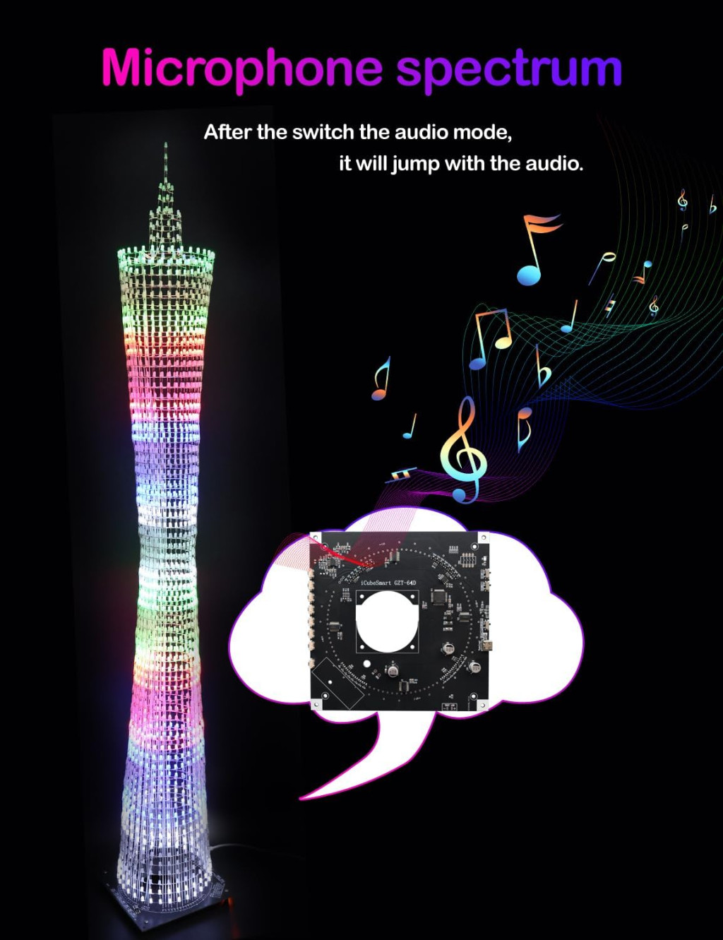 LED Canton Tower Model od iCubeSmart nie je len elektronický projekt, ale kompletný zážitok. Súprava je starostlivo navrhnutá tak, aby poskytovala maximálnu vzdelávaciu hodnotu a zábavu. Základná doska je už vopred spájkovaná a otestovaná, takže treba namontovať iba LED diódy, čo znižuje možnosť chyby. Vstavaný mikrofón a hudobný režim umožňujú, aby sa veža synchronizovala s vašou obľúbenou hudbou a vytvorila skutočne interaktívny zážitok.