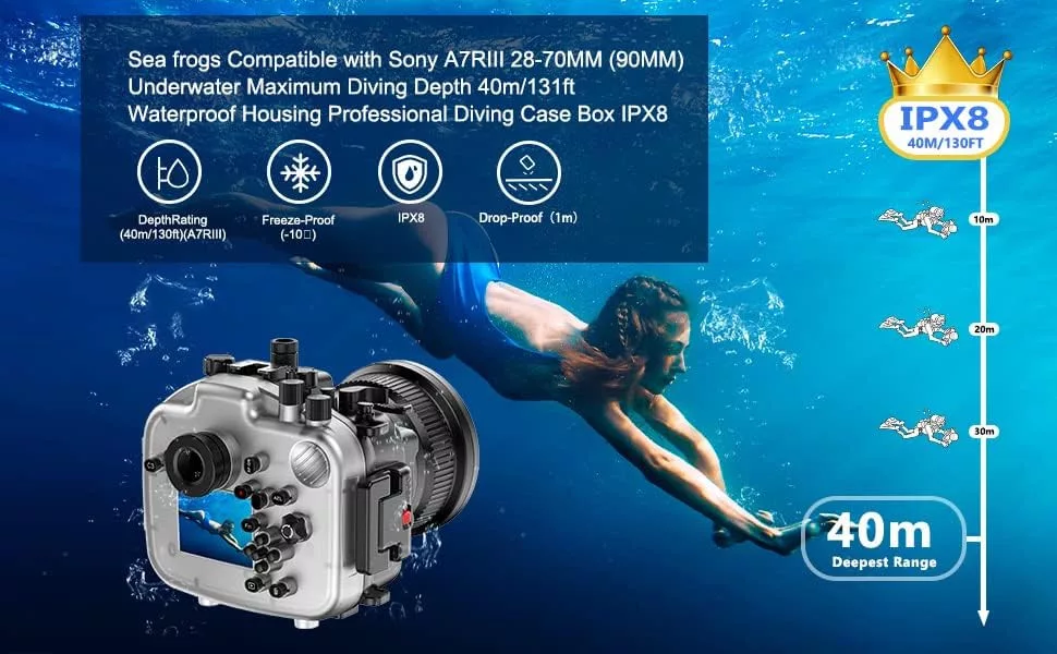 Podvodné puzdro Sea frogs je špeciálne navrhnuté pre fotoaparát Sony A7RIII 90 mm, aby poskytovalo dokonalú ochranu pre vaše cenné zariadenie aj v tých najextrémnejších podmienkach. S certifikáciou IPX8 je možné puzdro používať až do hĺbky 40 metrov (130 stôp), čo z neho robí ideálnu voľbu pre potápanie, surfovanie, veslovanie alebo dokonca zimné športy. Kryt, vyrobený z vysoko kvalitného polykarbonátu, ABS plastu a komponentov z nehrdzavejúcej ocele, chráni váš fotoaparát nielen pred vodou, ale aj pred prachom, nárazmi a mrazom, pričom všetky funkcie zostávajú ľahko dostupné.