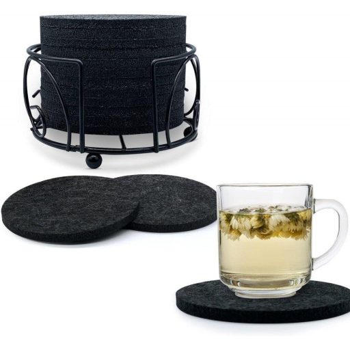 Súprava tmavosivých plstených podložiek pod poháre Súprava tmavosivých plstených podložiek pod poháre s kovovým stojanom - Umývateľné okrúhle podložky, 12-dielna sada