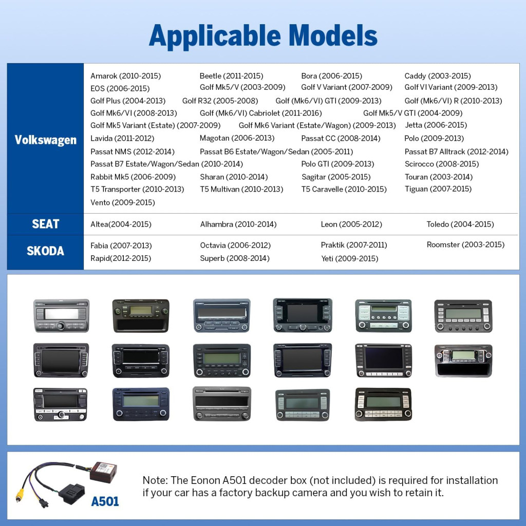 Az Eonon VWA13 széles körű kompatibilitást biztosít a Volkswagen, Seat és Skoda járművekkel: