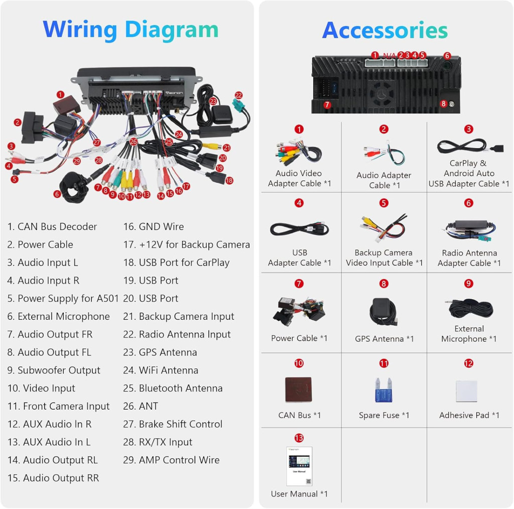 Az Eonon VWA13 autórádió teljes telepítési csomagot tartalmaz: