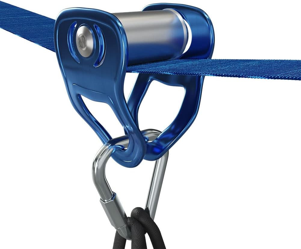A slackline tartós poliészterből készült, amely ellenáll az időjárás viszontagságainak. A csiga oldallapjai alumínium ötvözetből kovácsoltak a könnyű súly és a maximális erősség érdekében. A tengely rozsdamentes acélból precíziós megmunkált a maximális teherbírás érdekében. A súrlódási veszteség nagyon alacsony a kiváló minőségű golyóscsapágyaknak köszönhetően. Még alacsony lejtés esetén is elegendő sebességet biztosít, és könnyű csúszást garantál.