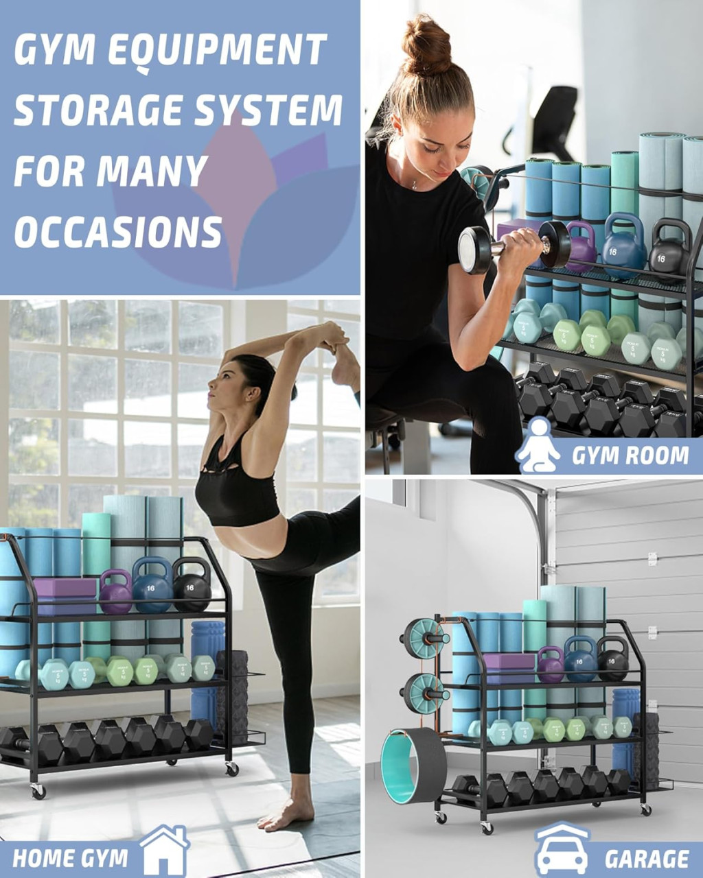 A Staransun hantelständer egy professzionális szintű tárolórendszer, amely tökéletesen alkalmas otthoni edzőtermek, garázs és lakóterek számára. Ez a robusztus állvány három nyitott, széles polccal és két kiegészítő oldalsó tárolóhellyel rendelkezik, amely elegendő helyet biztosít jógaszőnyegeknek, kézi súlyoknak és egyéb edzőeszközöknek. Az 54 hüvelykes szélesség jelentősen meghaladja az átlagos 42 hüvelykes szélességet, így sokkal több tárolási lehetőséget kínál.