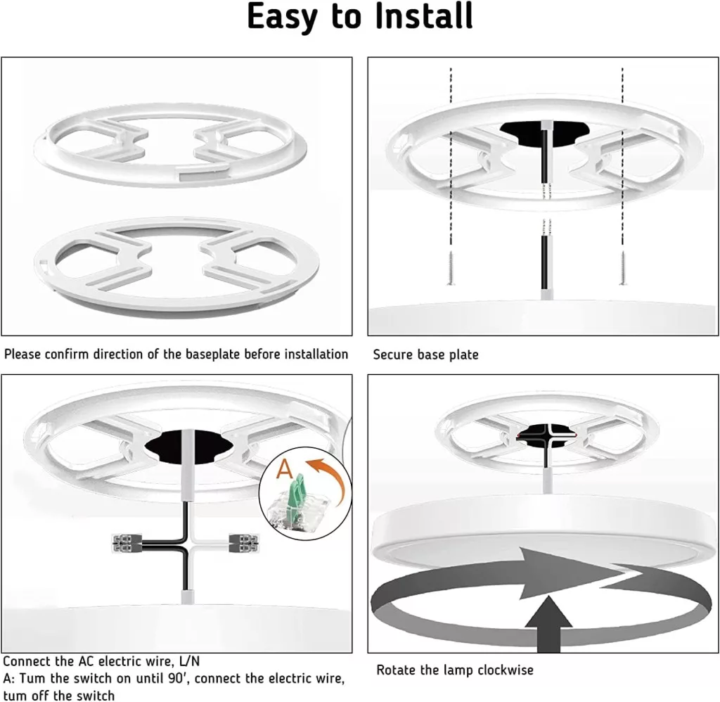 Svietidlo sa pripája k elektrickej sieti 120 V a je kompatibilné s väčšinou štandardných bodov upevnenia na strope. Jednoduchý skrutkovací mechanizmus umožňuje rýchlu a ľahkú inštaláciu aj pre laikov. Balenie obsahuje všetky potrebné káblové príchytky a montážne príslušenstvo. Kryt z ABS plastu je odolný a má dlhú životnosť, pričom lakovaný biely povrch sa ľahko čistí.