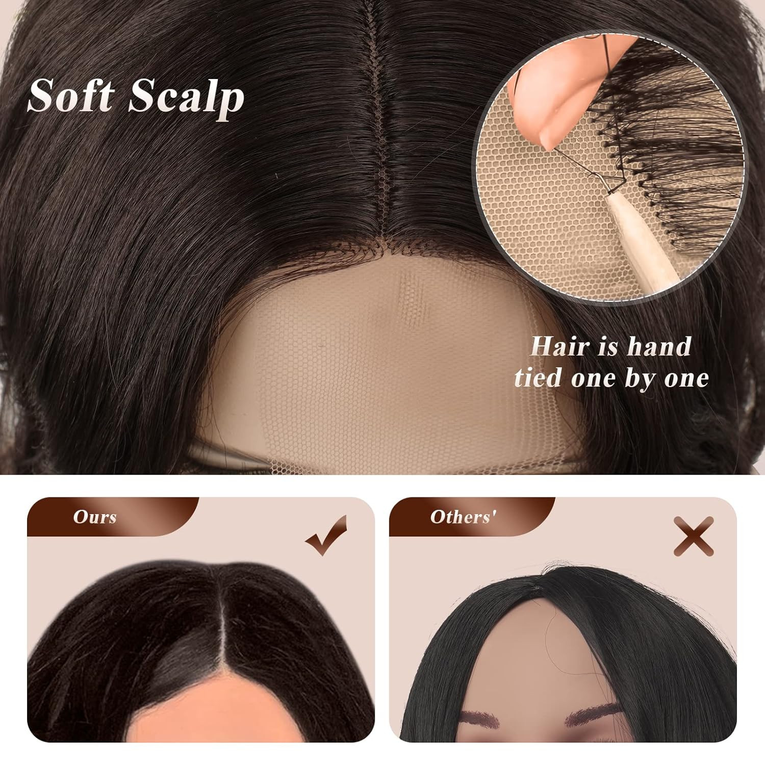 • Kézzel varrt teteje: A vékony, kézzel varrt teteje biztosítja, hogy a paróka tökéletesen illeszkedjen a fejbőrhöz