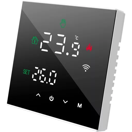A Beok TGW60B-WIFI-WP okos termosztát forradalmasítja a padlófűtés vezérlését. Ez az intelligens eszköz egyesíti a modern technológiát a praktikus funkcionalitással, lehetővé téve a távoli vezérlést és az energiatakarékos működést. A fekete színű, elegáns LCD érintőképernyős design tökéletesen illeszkedik bármilyen modern otthon stílusához.