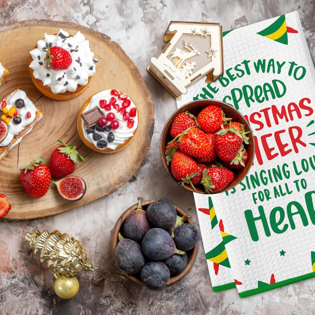 - ???? Ikonické filmové citáty: Dve utierky sú zdobené rôznymi citátmi z filmu "Buddy": "I Just Like to Smile, Smiling's My Favorite" a "The Best Way to Spread Christmas Cheer is Singing Loud for All to Hear".