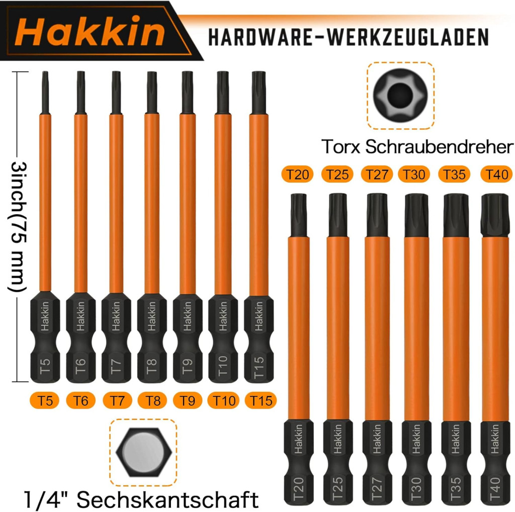 A Hakkin 13 részes Torx bit készlet egy kiváló minőségű, professzionális szerszám, amely ideális választás barkácsokhoz, autójavításhoz és elektronikai munkákhoz. Az S2 acél anyag, a mágneses tipp, a tamperproof kialakítás és a teljes mérettartomány biztosítja a megbízható és hatékony munkavégzést. A nikkelezett felület hosszú élettartamot garantál, míg a 75 mm hossz elegendő a nehéz hozzáférésű helyekhez. Ha professzionális minőségű Torx biteket keres, a Hakkin készlet kiváló választás.
