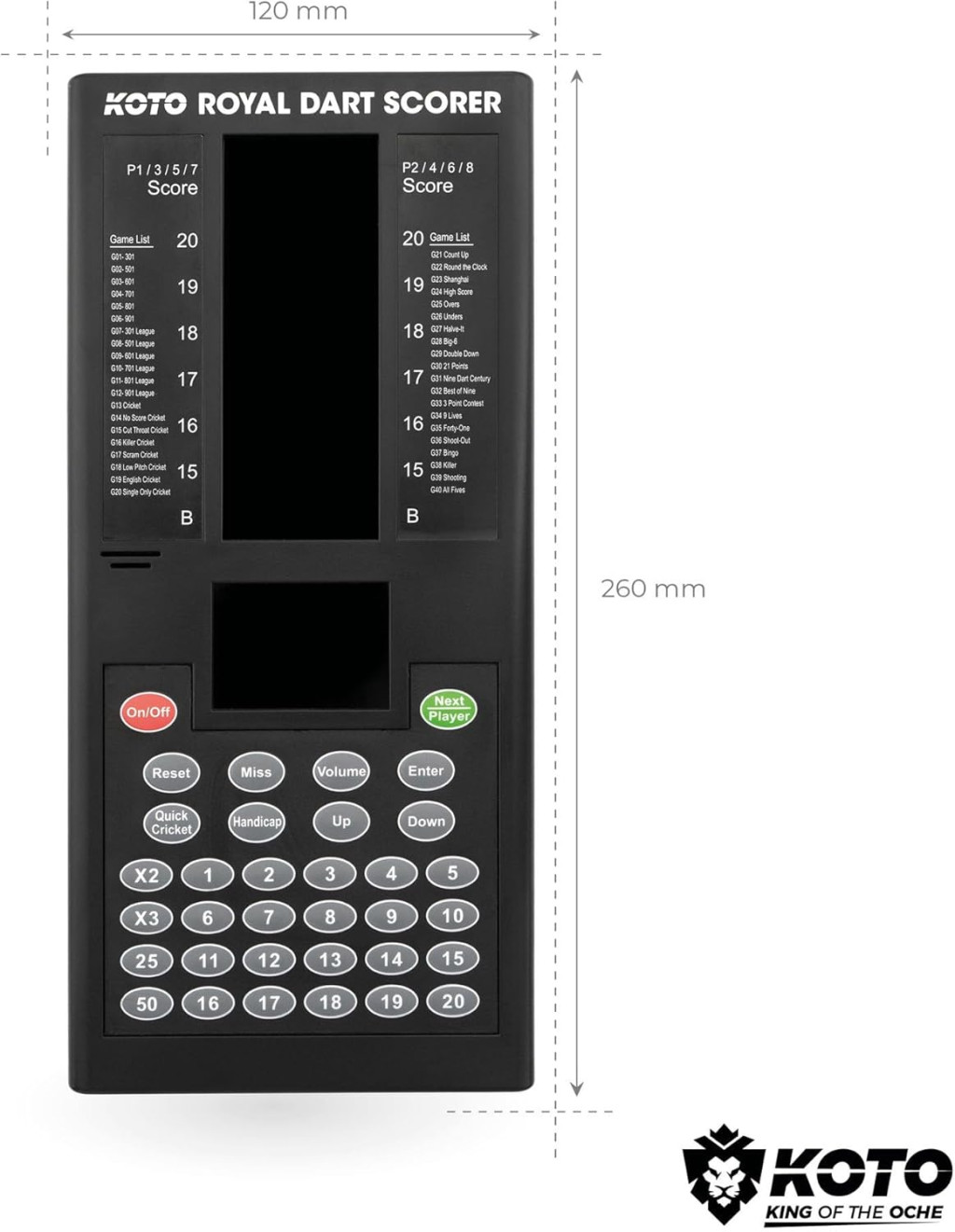 A KOTO Royal Dart Számláló egy professzionális elektronikus pontszámláló rendszer, amely forradalmasítja a dart játék élményét. Ez a kiváló minőségű eszköz 40 különböző játékmódot kínál 427 variációval, így minden dart rajongó megtalálja a számára megfelelő kihívást. A készülék akár 8 játékos egyidejű részvételét is támogatja, így tökéletes választás családi összejövetelekhez, baráti bulikhoz vagy akár profi versenyekhez is.