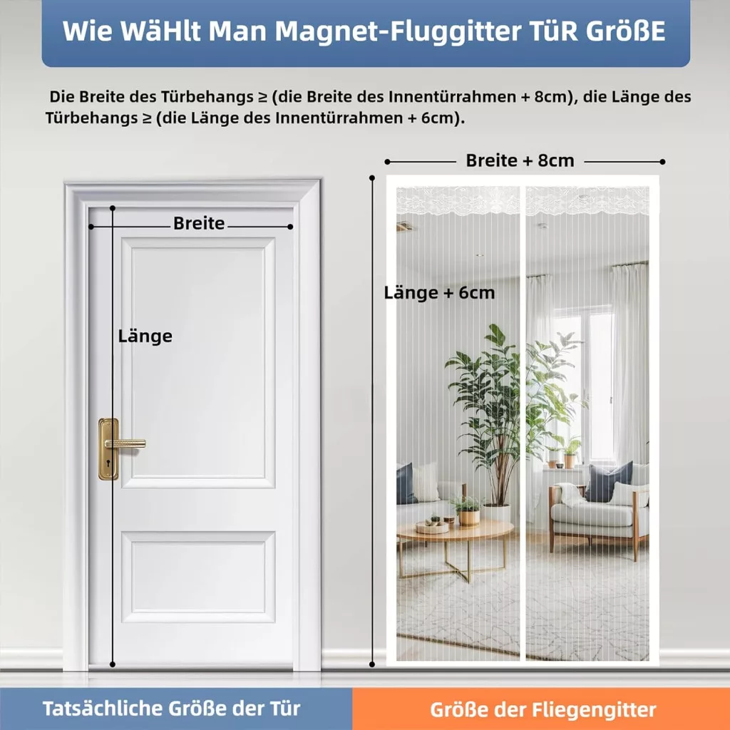 • Rozmery: Pre výber správnej veľkosti použite nasledujúci vzorec: Šírka dverného závesu ≥ (šírka vnútorného rámu dverí + 8 cm), dĺžka dverného závesu ≥ (dĺžka vnútorného rámu dverí + 6 cm).