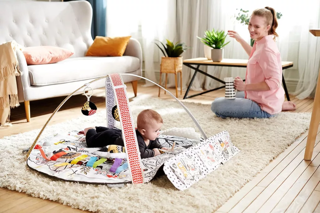 - Rozvoj zraku: Intenzívne kontrastné vzory a živé farby (čierno-biela, červená, žltá) pomáhajú rozvíjať vizuálne vnímanie