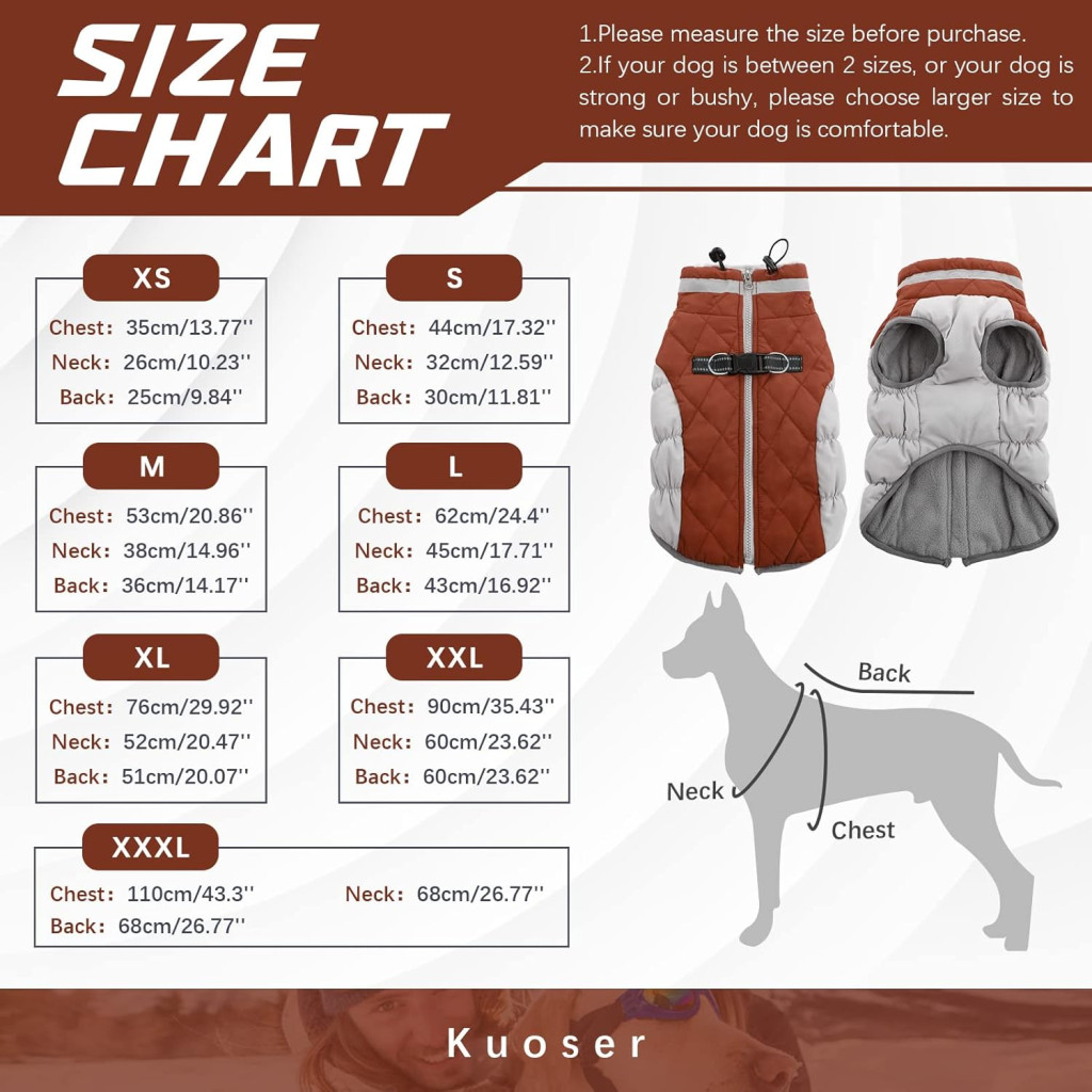 A Kuoser téli kutyakabát 7 különböző méretben érhető el, amely szinte minden kutyafajtához megfelel. Az elérhető méretek: XS, S, M, L, XL, XXL és 3XL. Ez a széles mérettartomány biztosítja, hogy megtalálod a tökéletes illeszkedést kutyádnak, legyen az egy kicsi Chihuahua vagy egy nagy Labrador Retriever.