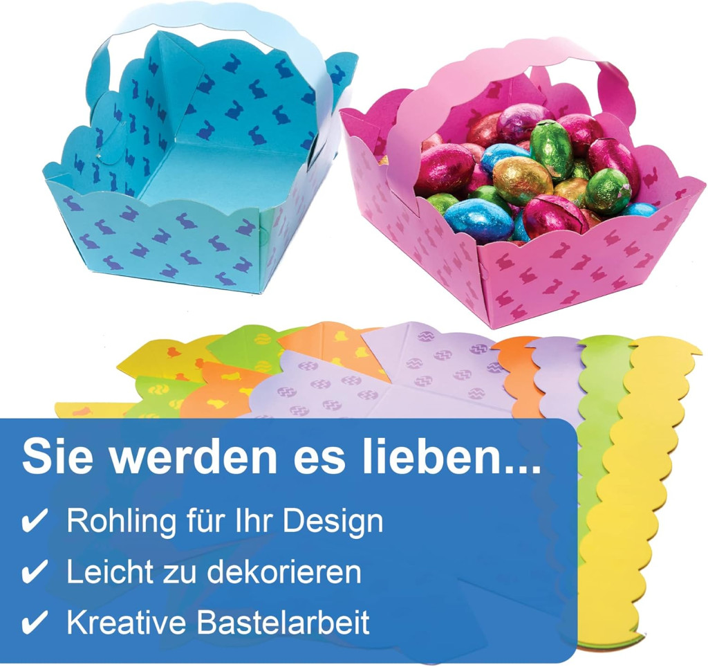 A Baker Ross FX545 Húsvéti Kosarak egy kiváló választás azoknak, akik kreatív és szórakoztató húsvéti tevékenységeket szeretnének szervezni. A 30 darabos csomag, a vonzó designok és a vibráló szín variációk biztosítják, hogy minden gyerek megtalálja a kedvencét. Az előre nyomtatott kosarak könnyen összehajthatók, és azonnal használhatók húsvéti tojáskereséshez vagy díszítéshez.