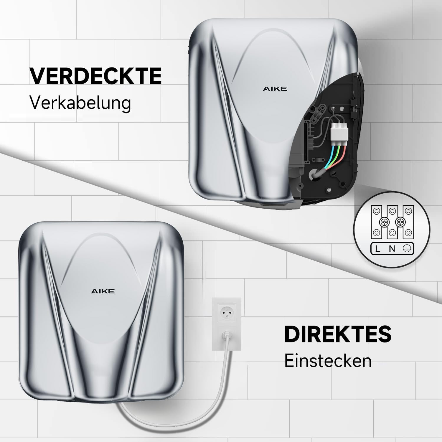 Az AIKE Elephant AK2812 rendkívül rugalmas telepítési lehetőségeket kínál. A készülék EU típusú C/EF csatlakozóval rendelkezik, amely 220-240V, 50/60 Hz hálózathoz csatlakoztatható. A 115 cm hosszú kábel lehetővé teszi a rugalmas elhelyezést, vagy eltávolítható a kemény bekötéshez.