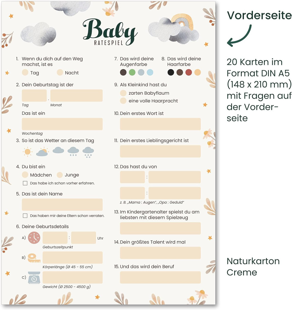 Ez a játék nem csupán szórakoztatás, hanem egy gyönyörű emlékmű az izgalommal teli várakozás időszakáról. A kártyák elülső oldala gondosan összeállított kérdéseket tartalmaz a születésről és a baba fejlődéséről, míg a hátoldal személyes üzeneteknek és jókívánságoknak ad helyet.