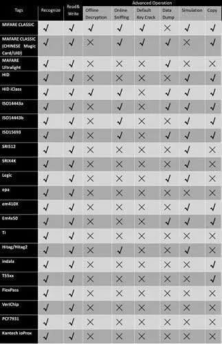 Zariadenie Proxmark3 RDV2 má širokú kompatibilitu, ktorá umožňuje spracovanie rôznych typov RFID a NFC kariet: