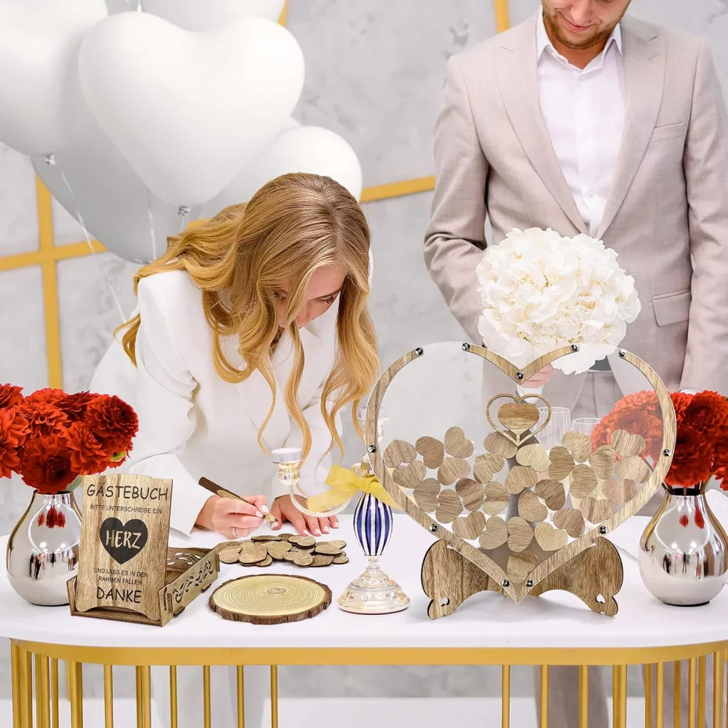 Ez a gyönyörű fa esküvői vendégkönyv egy kreatív és romantikus alternatívája a hagyományos vendégkönyveknek. A szív alakú design nemcsak esztétikailag lenyűgöző, hanem praktikus megoldást is kínál az esküvői emlékek megőrzésére. A vendégek kis fa szívekre írhatják fel jókívánságaikat, amelyek aztán a nagy szív alakú keretbe helyezhetők, így egy egyedi és személyes emlékművet alkotva.
