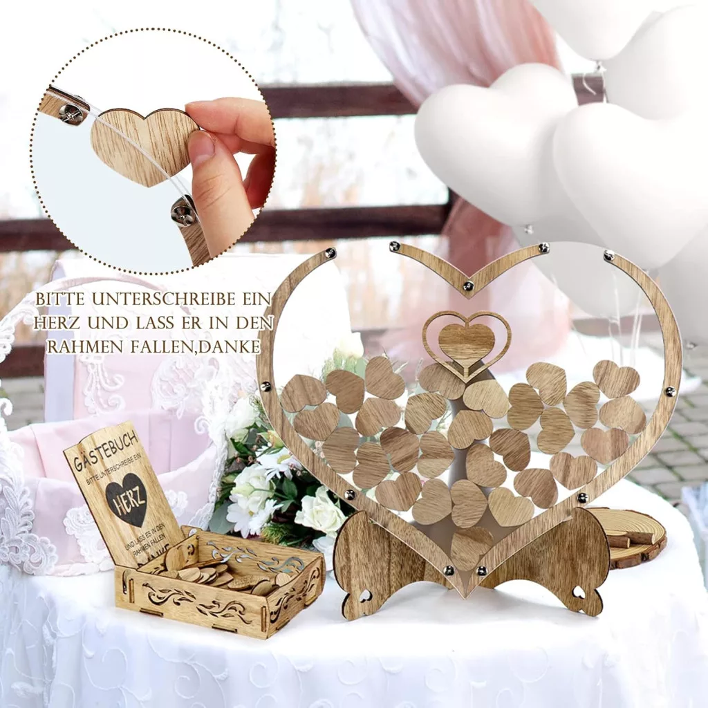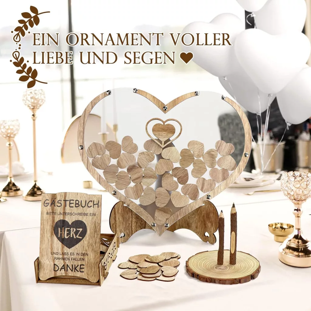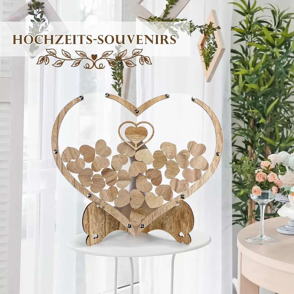 A termék különlegessége abban rejlik, hogy minden egyes kis szív egy-egy vendég üzenetét hordozza, így az esküvő után is folyamatosan felidézhető az a szeretet és jókívánság, amit a násznép kifejezett. A természetes fenyőfa anyag tartósságot és elegáns megjelenést biztosít, míg a gondosan kidolgozott design minden esküvői stílushoz illeszkedik.