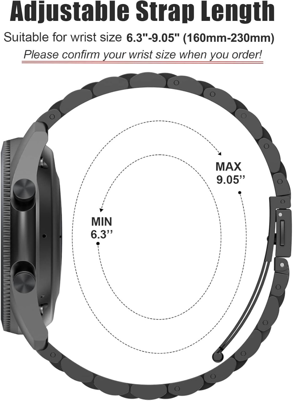 - Nastaviteľná veľkosť: Možno prispôsobiť pre obvod zápästia od 160 mm do 230 mm, pomocou priloženého nástroja je možné ľahko odstrániť alebo vrátiť články.
