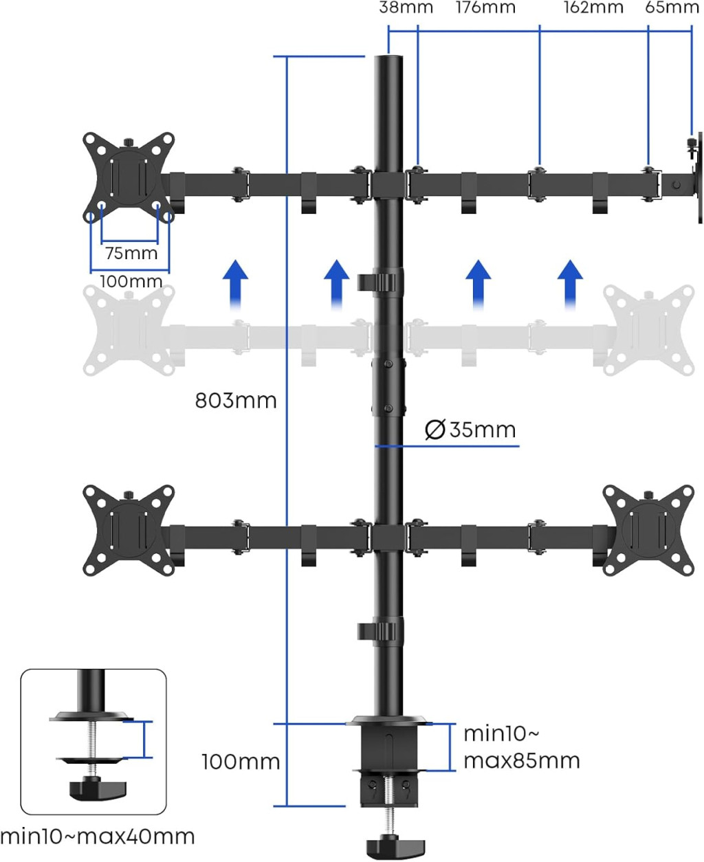 A 803 mm magas hosszú rúd lehetővé teszi a precíz magasságállítást, míg a négy kar teljes mozgékonyságot biztosít. Ez a megoldás ideális irodai munkához, kereskedéshez, biztonsági monitorozáshoz és egyéb professzionális alkalmazásokhoz.