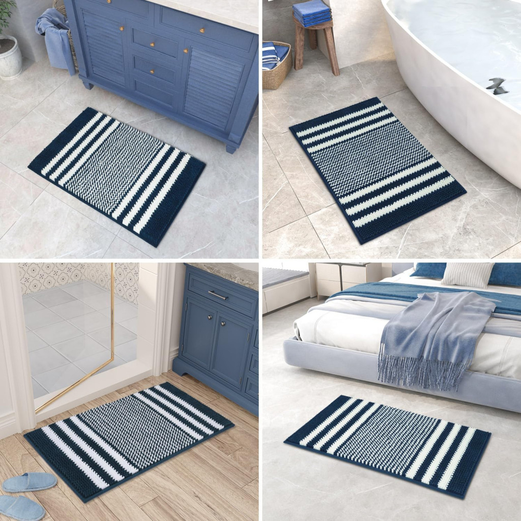 Biscpro fürdőszobai szőnyeg 60x90 cm sötétkék csíkos puha chenille, csúszásmentes