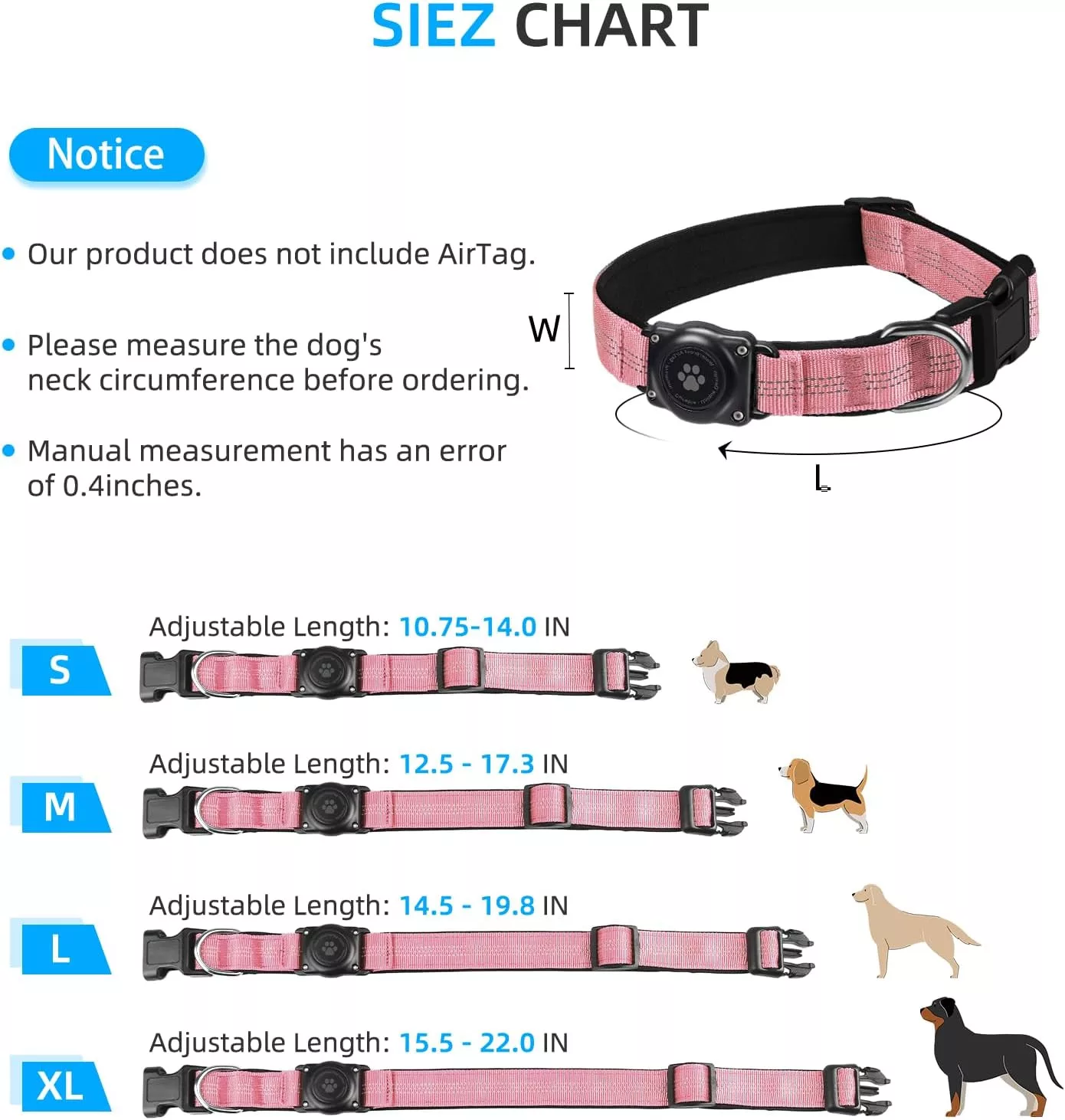 Az L méretű nyakörv 14,5-20,8 cm közötti nyakkerülethez alkalmas. Mérje meg kutyája nyakát a vásárlás előtt. A nyakörv teljesen kompatibilis az Apple AirTag-gel, és a csomag tartalmaz egy csavarhúzót az AirTag behelyezéséhez.