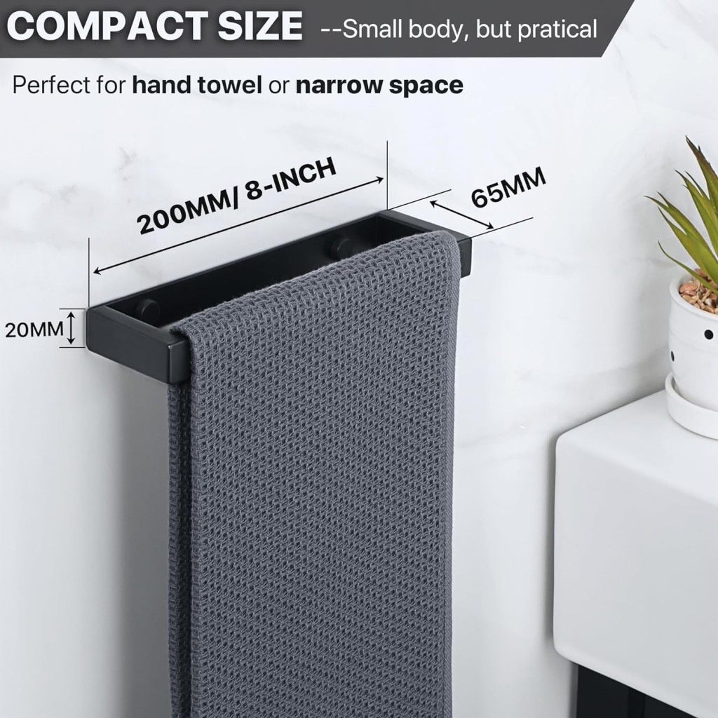 A SAYAYO törölközőtartó rúd a modern fürdőszoba és konyha tökéletes kiegészítője. Ez a 20 cm-es, matt fekete felületű törölközőtartó prémium minőségű SUS 304 rozsdamentes acélból készült, amely hosszú távú tartósságot és ellenállóságot biztosít a nedves környezetben. A kompakt mérete ideális kisebb terekben való használatra, miközben elegáns megjelenése bármilyen berendezési stílushoz illeszkedik.