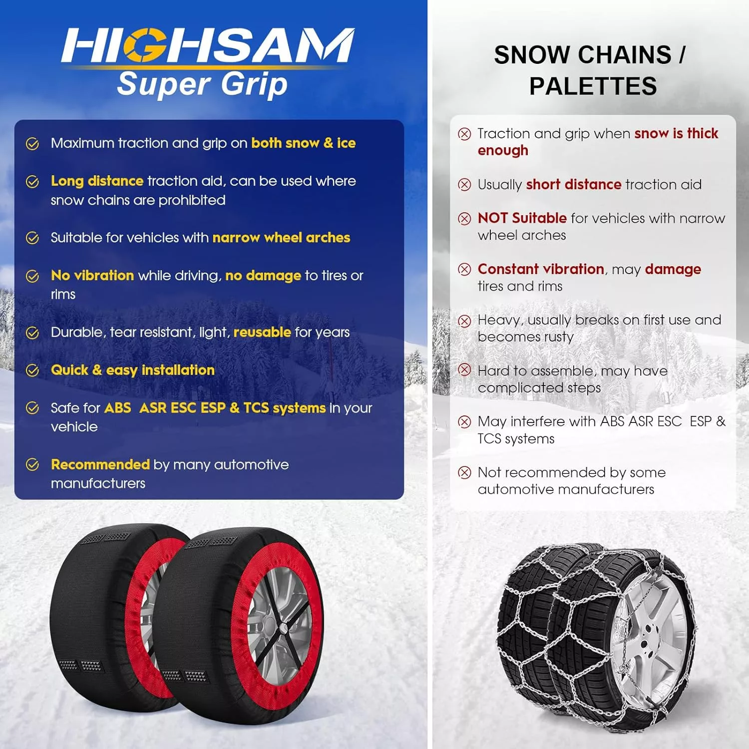 Špeciálny dizajn snehových ponožiek highsam SUPER GRIP umožňuje ich rýchlu a jednoduchú montáž aj v extrémnych poveternostných podmienkach. Na rozdiel od tradičných kovových snehových reťazí nespôsobujú nepríjemné vibrácie a hluk počas jazdy, takže zážitok z jazdy zostáva oveľa komfortnejší.