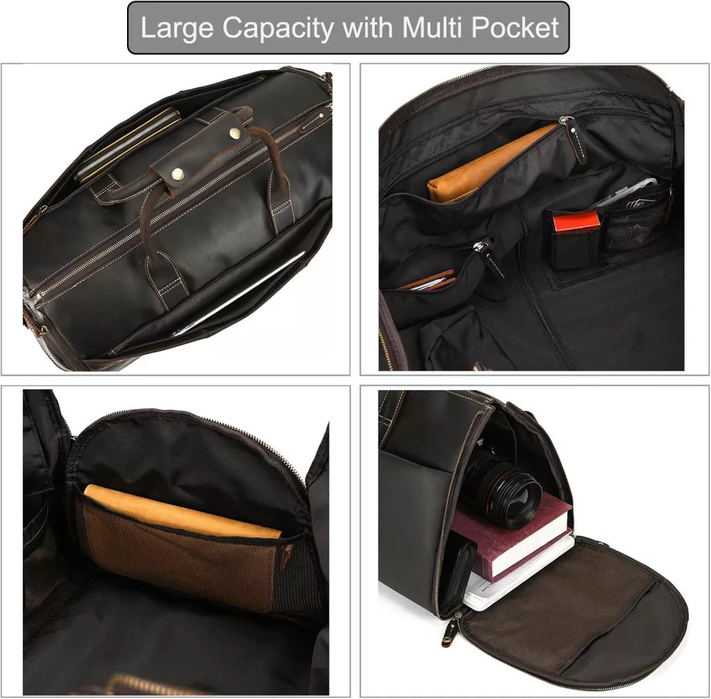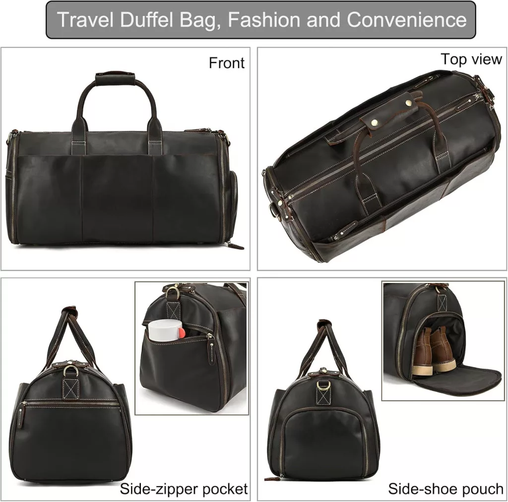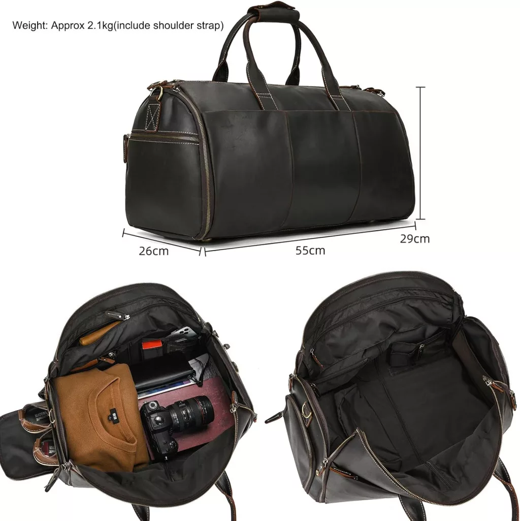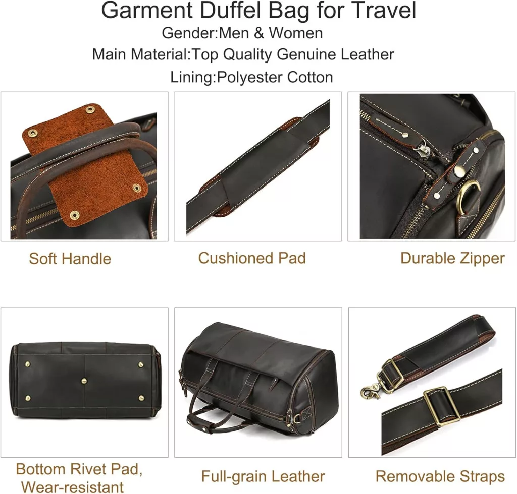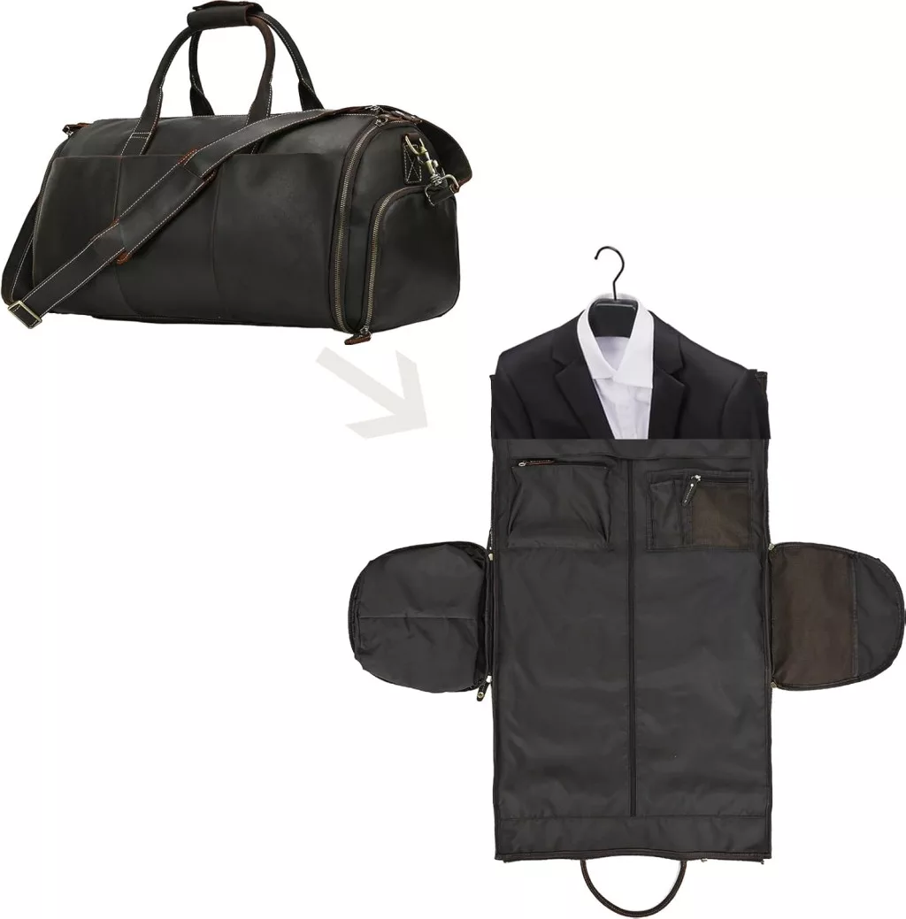 Kožená cestovná taška LUUFAN je inovatívne riešenie 2 v 1, ktoré spája funkcie obalu na oblek a cestovnej tašky. Táto všestranná taška je perfektnou voľbou na pracovné cesty, víkendové výlety a formálne udalosti. Keď ju otvoríte a rozložíte, funguje ako vertikálny obal na oblek, ktorý chráni vaše oblečenie pred pokrčením. Po zložení sa zmení na praktickú 45-litrovú cestovnú tašku, ktorá spĺňa požiadavky väčšiny medzinárodných leteckých spoločností na príručnú batožinu.