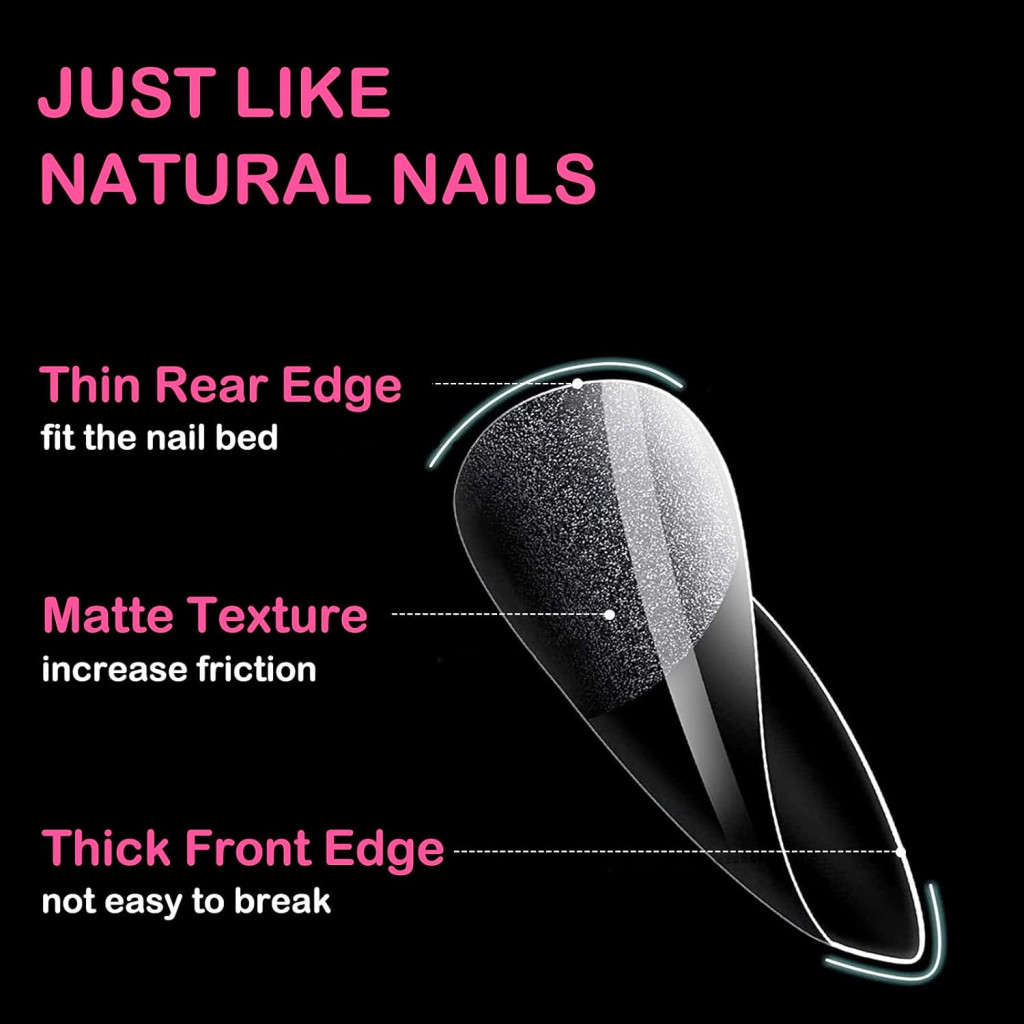 Ezek a körömtippek sokoldalúan alkalmazhatók: géles lakk, körömművészeti tervek, press-on körömök, akril festékek, dip powder körömök vagy polimer körömhosszabbítás készítéséhez. A félig matt felület kiváló tapadást és súrlódást biztosít, amely megkönnyíti a körömtippek felhelyezését és rögzítését. Mindössze három perc alatt hosszabbíthatja meg körömeit, és élvezheti a szalon minőségű eredményt otthonában.