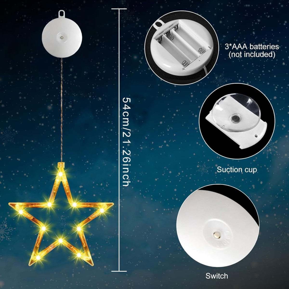 Táto nádherná LED vianočná dekorácia na okno v tvare hviezdy v súprave 4 kusov je ideálnou voľbou na vytvorenie sviatočnej atmosféry. Svetelné dekorácie sú vybavené prísavkami a fungujú na batérie, vďaka čomu ich môžete ľahko pripevniť na okná, dvere a iné hladké povrchy. Klasický tvar hviezdy a teplé LED svetlo zaručene vytvoria vo vašom domove čarovnú atmosféru.