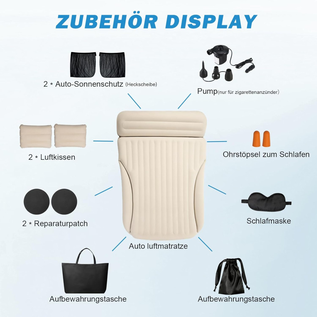 - Komplett kempingező szett: Elektromos légpumpa, 2 felfújható párna, 2 napellenző, szemtakaró, füldugó és javítókészlet