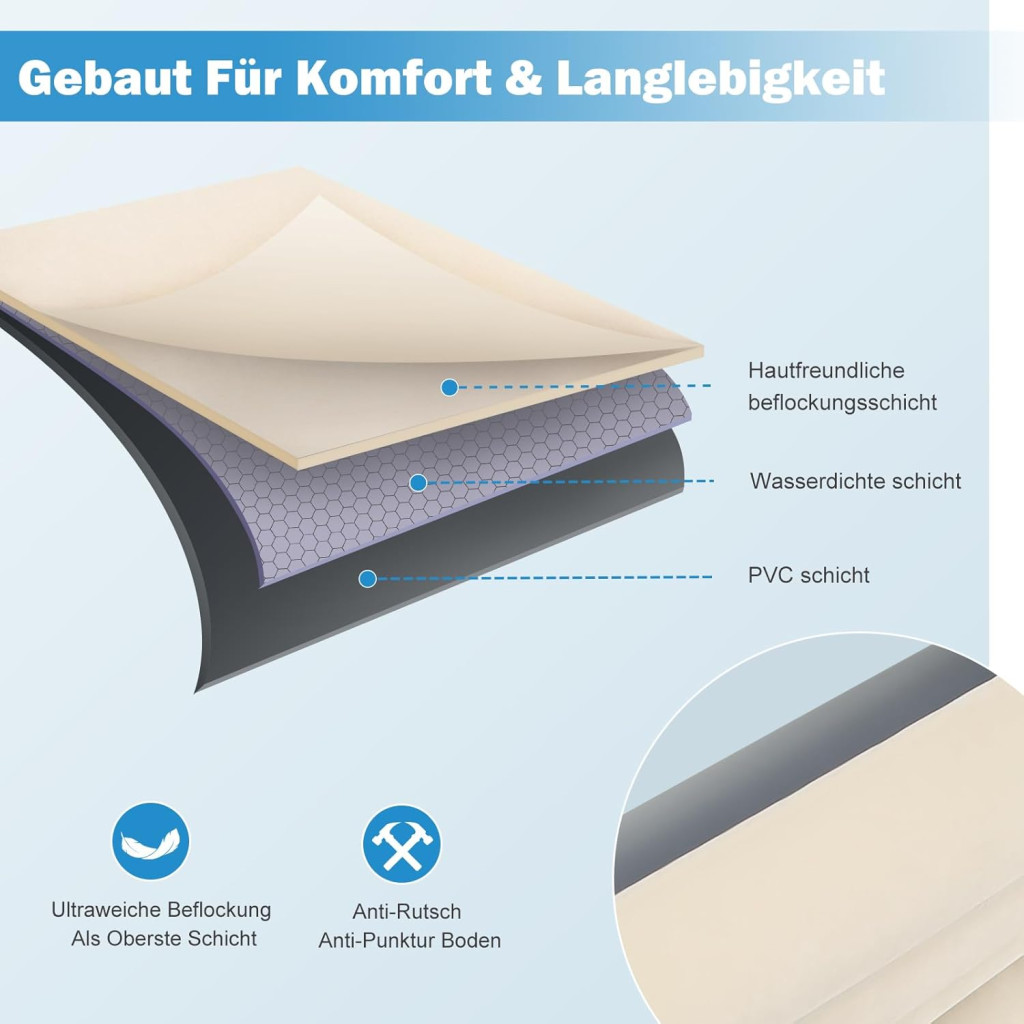 A 15 cm vastag, innovatív légkamrás szerkezettel rendelkező matrac akár 300 kg terhelést is elbír, miközben páratlan kényelmet és stabil alátámasztást biztosít. A bársonyos, vízálló felület és a csúszásmentes alap kombinációja garantálja, hogy éjszakája nyugodt és zavartalan legyen, bárhol is járjon.