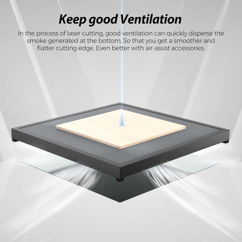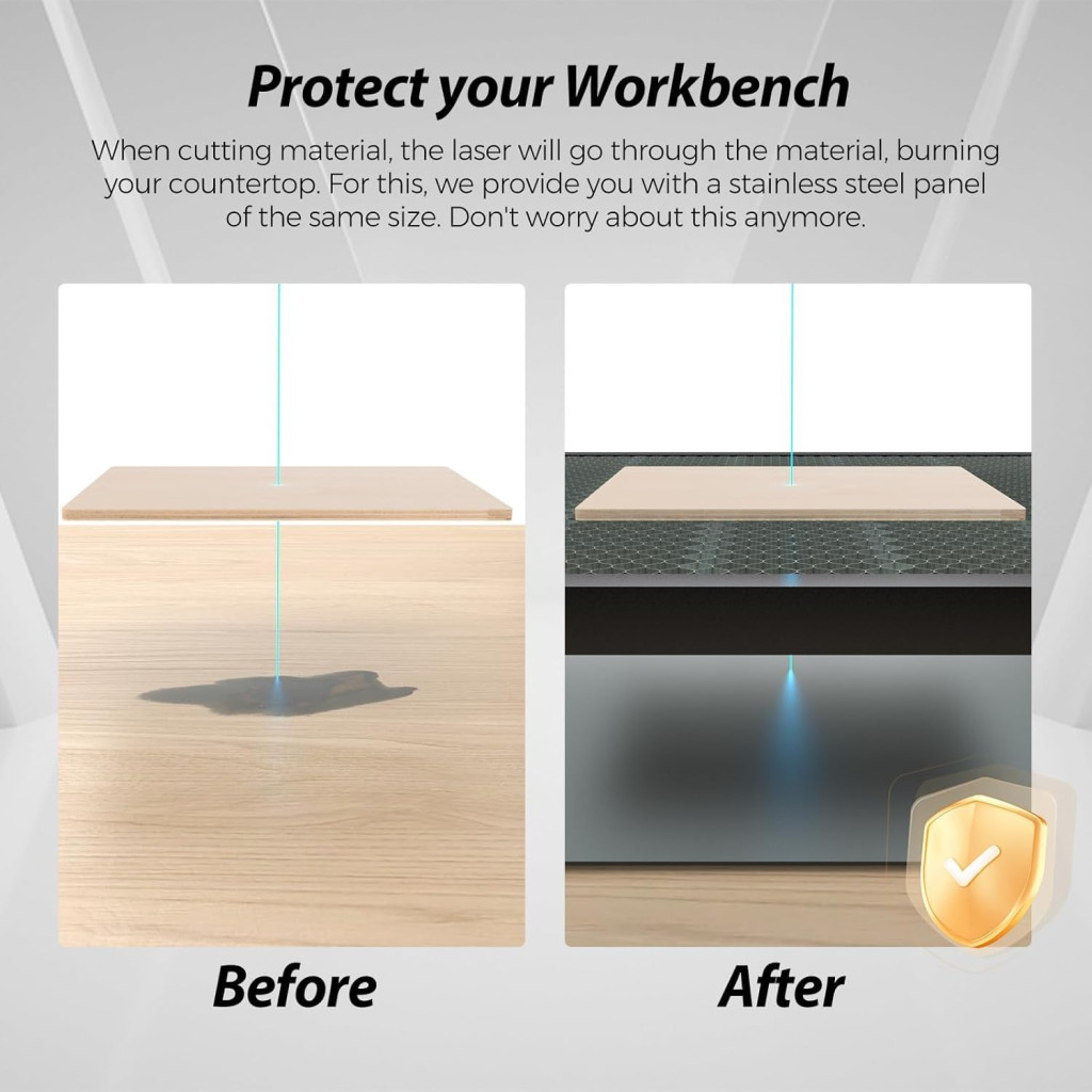 Voštinová štruktúra je obzvlášť užitočná pri gravírovaní jemných detailov, pretože dym a plyny sa efektívne odvádzajú, takže neprekážajú pri práci. Hliníková ochranná doska zabezpečuje, že povrch stola zostane dlho nepoškodený aj pri intenzívnom používaní.