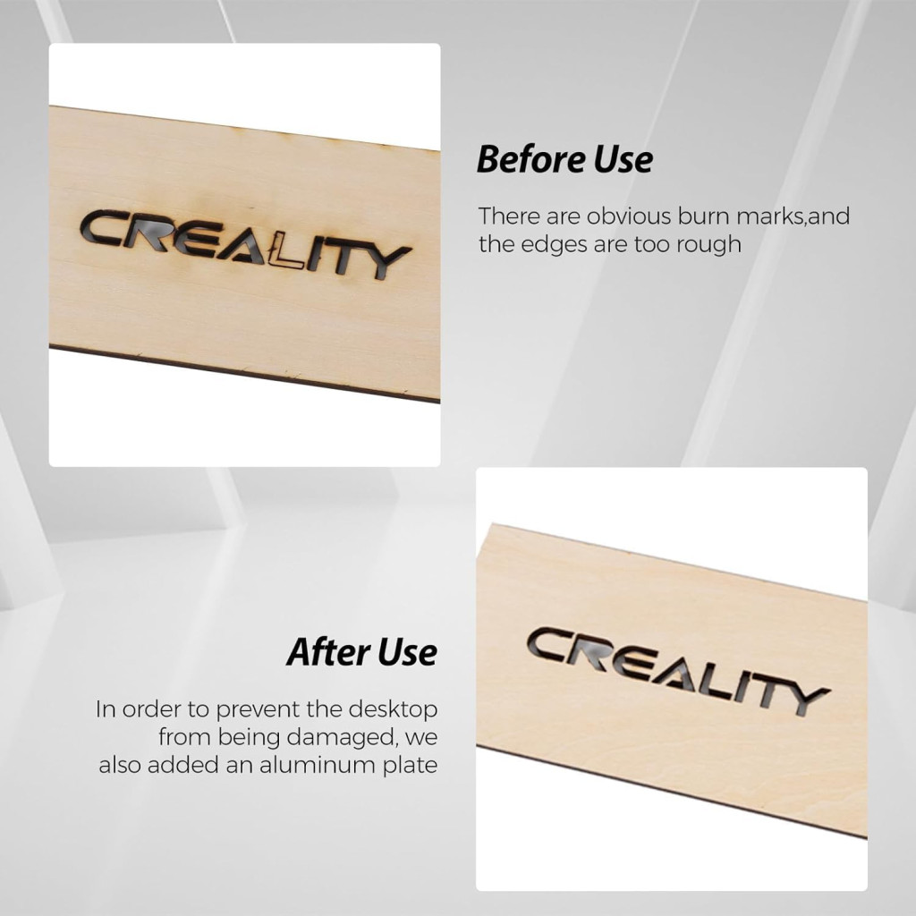 12 extra zdvihákov umožňuje nastavenie výšky, vďaka čomu môžete spracovávať materiály rôznej hrúbky. Silikónové nožičky zaisťujú správnu vzdialenosť pre odvetrávanie dymu, čo zvyšuje efektivitu práce. Záruka a zákaznícka podpora Creality zaručujú, že v prípade akýchkoľvek problémov získate rýchlu pomoc.