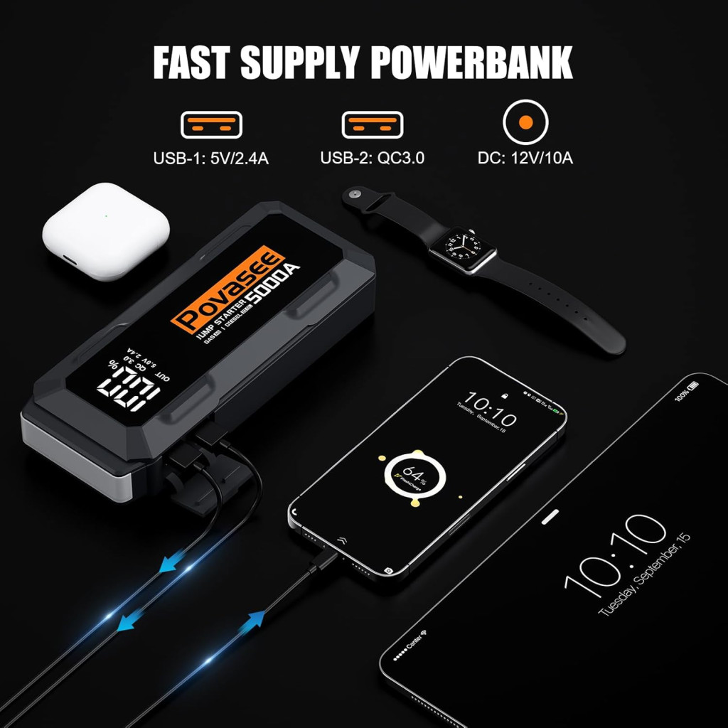 Povasee A40 je profesionálna štartovacia power banka do auta so špičkovým prúdom 5000 ampérov. Toto kompaktné a prenosné zariadenie je ideálnym riešením pre všetky 12-voltové vozidlá, či už ide o osobné autá, nákladné vozidlá, motocykle alebo kosačky na trávu. Lítium-polymérová batéria s kapacitou 88,8 Wh zaručuje, že svoje vozidlo naštartujete vždy, keď to najviac potrebujete. Zariadenie vydrží po úplnom nabití fungovať až 60 minút, takže bude spoľahlivým spoločníkom aj na dlhých cestách.