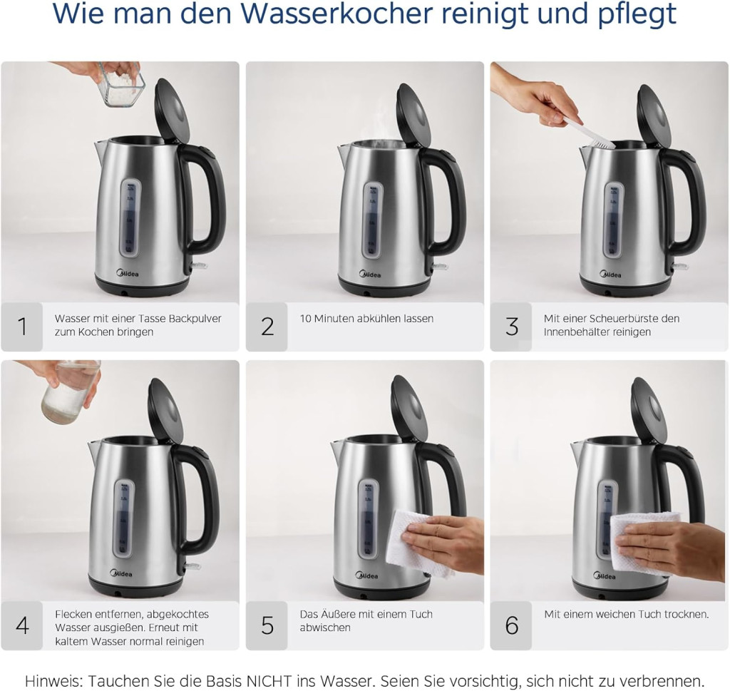 A Midea vízforraló könnyen tisztítható és karbantartható. A széles nyílás lehetővé teszi az egyszerű feltöltést és tisztítást. Az alábbi módszerek ajánlottak a hosszú élettartam biztosítása érdekében: