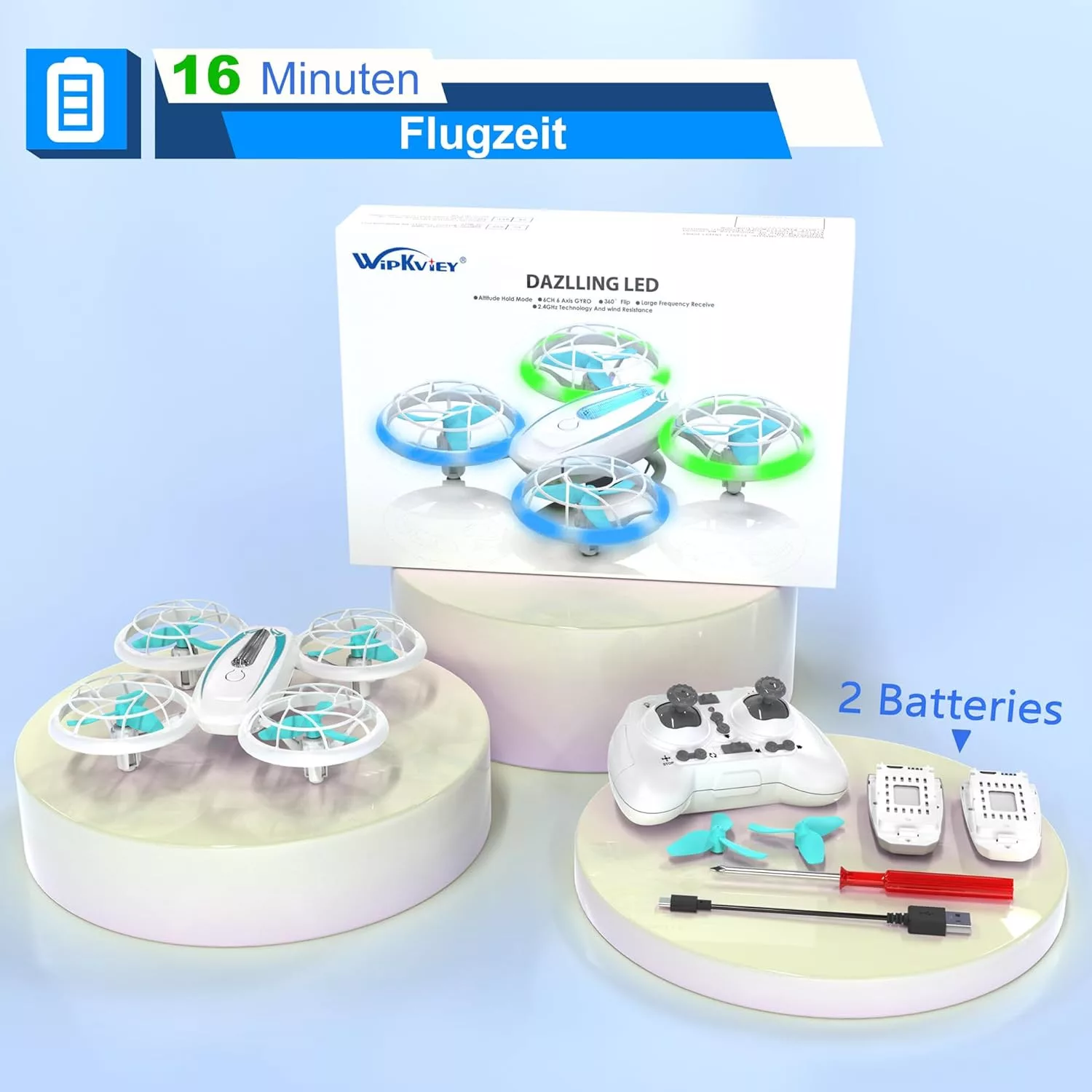 Wipkviey T18 Mini Drón Gyerekeknek - LED Fényekkel, 360° Forgással, Magasságtartással, Fejnélküli Móddal, 16 Perc Repülési Idővel, 2 Akkumul