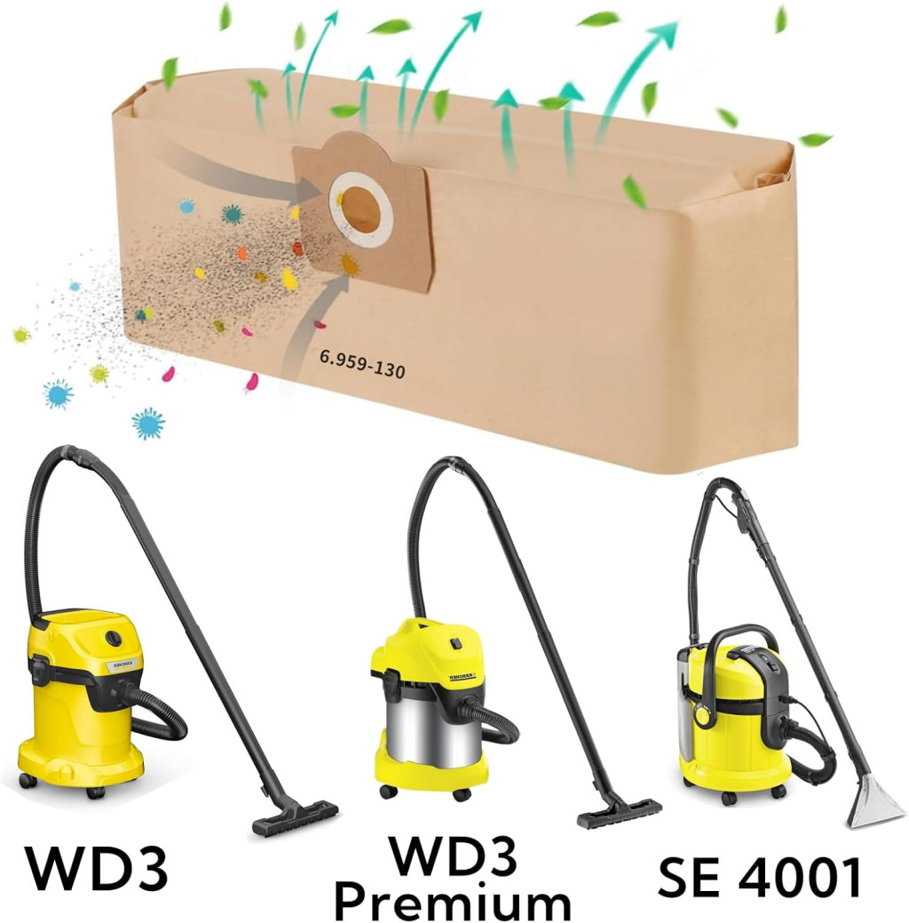 Összefoglalás: Prémium minőségű, költséghatékony szűrőzsák csomag, amely garantálja a tiszta levegőt és a hosszú porszívó élettartamot. Ajánlott minden Kärcher WD3, MV3 és SE4001/4002 porszívó tulajdonosnak.