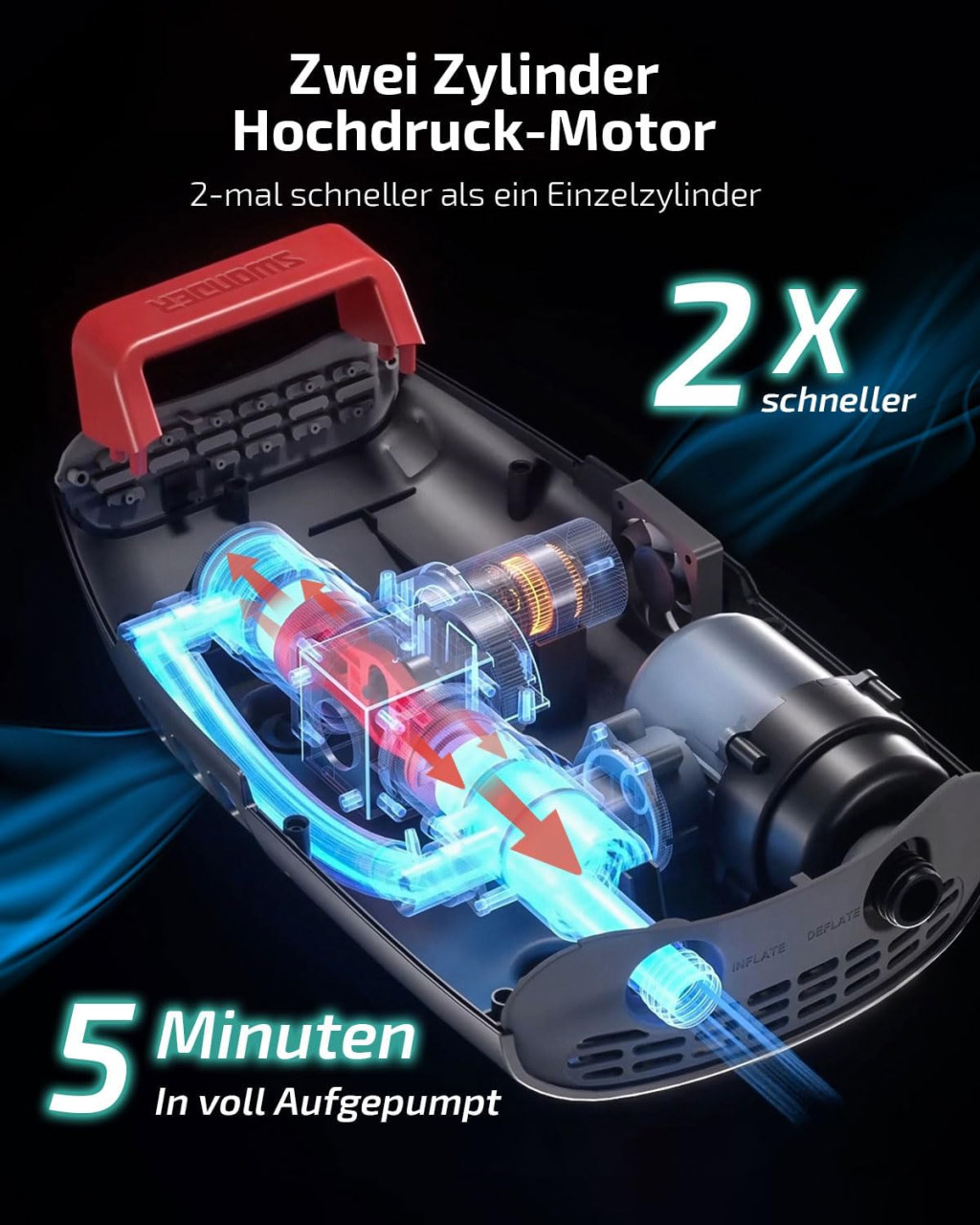 - 2x rýchlejšie nafukovanie: Systém s dvojitým piestom a prietokom vzduchu 100 l/min, ktorý je 2x rýchlejší než bežné pumpy s výkonom 75 l/min.